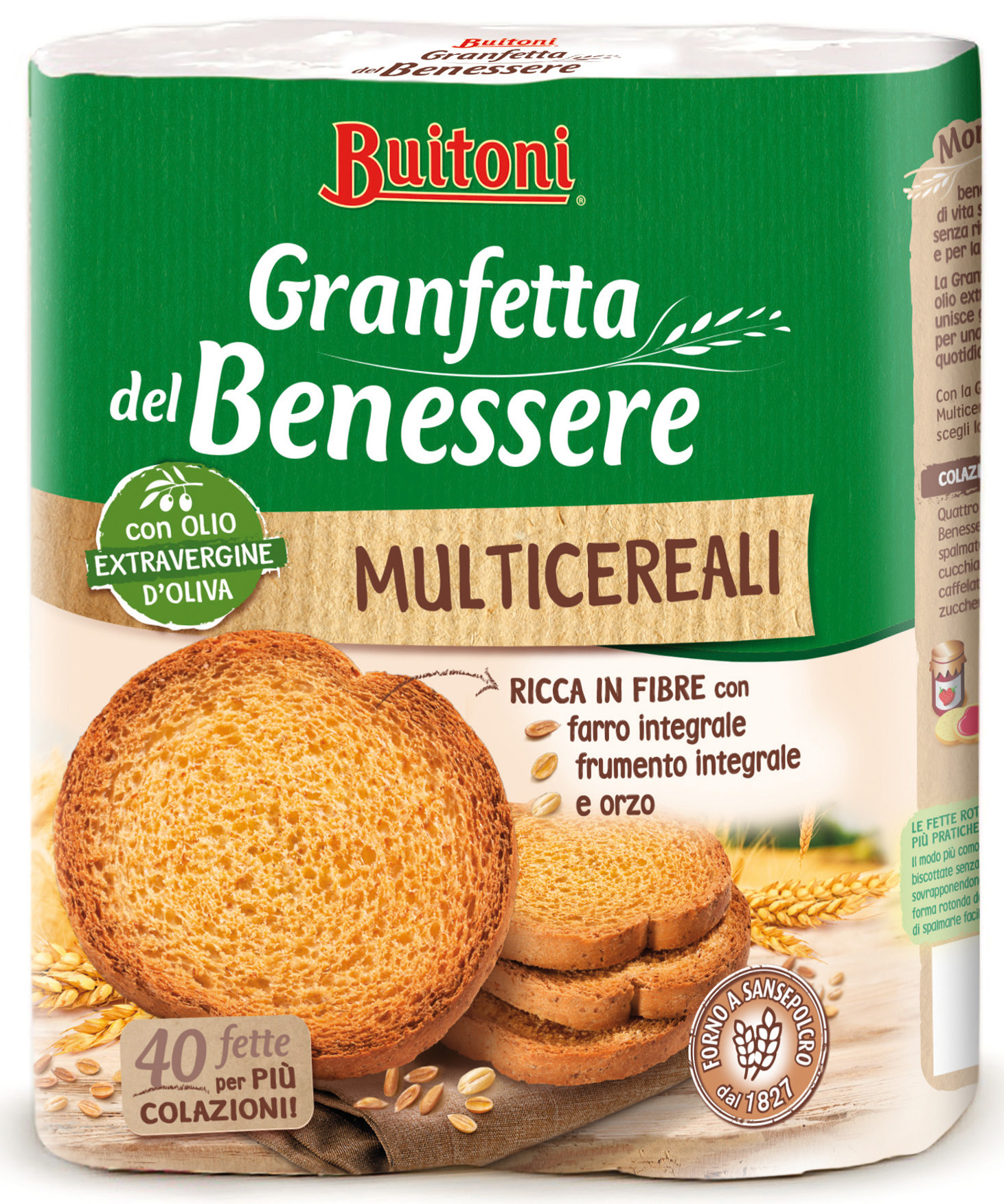 Buitoni, Granfetta del Benessere multicereali. Ingredienti: Farina di frumento, farina di frumento integrale 26,8%, olio extravergine d’oliva 4%, destrosio, farina di farro integrale 3,3%, lievito, glutine di frumento, farina di orzo maltato tostato 2,5%, estratto di malto (da orzo e mais), sale, fibra di frumento, rosmarino. |
