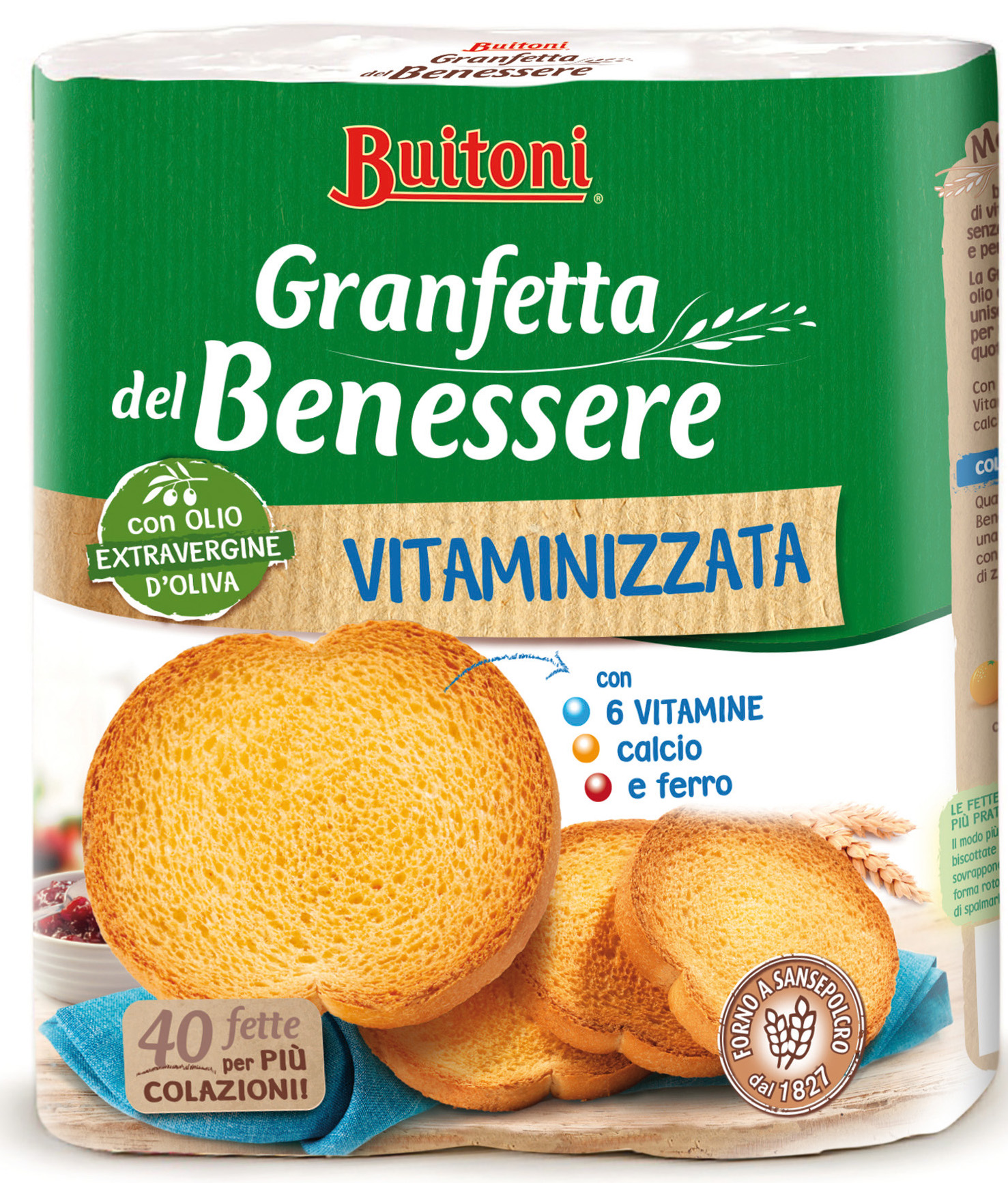 Buitoni, Granfetta del Benessere vitaminizzata. Ingredienti: Farina di frumento, olio extravergine di oliva 4%, destrosio, lievito, estratto di malto (da orzo e mais), sale, carbonato di calcio, lattato di ferro, vitamine (PP, B5, B6, B2, B1, folacina) |