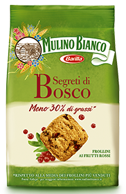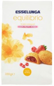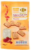 Carrefour, linea InForma, Frollini ai frutti rossi preparati con yogurt magro. Ingredienti: farina di grano tenero tipo “0”, farina di riso, zucchero, olio di semi di girasole, sciroppo di glucosio – fruttosio da frumento, yogurt magro 3%, frutti rossi disidratati in porzione variabile 1,4% (fragole e lamponi), estratto proteico da pisello, fibra vegetale da cicoria, sciroppo di glucosio, agenti lievitanti (carbonato acido di ammonio, fosfato monocalcico, carbonato acido di sodio), emulsionante: lecitina di soia, sale, aroma naturale. |