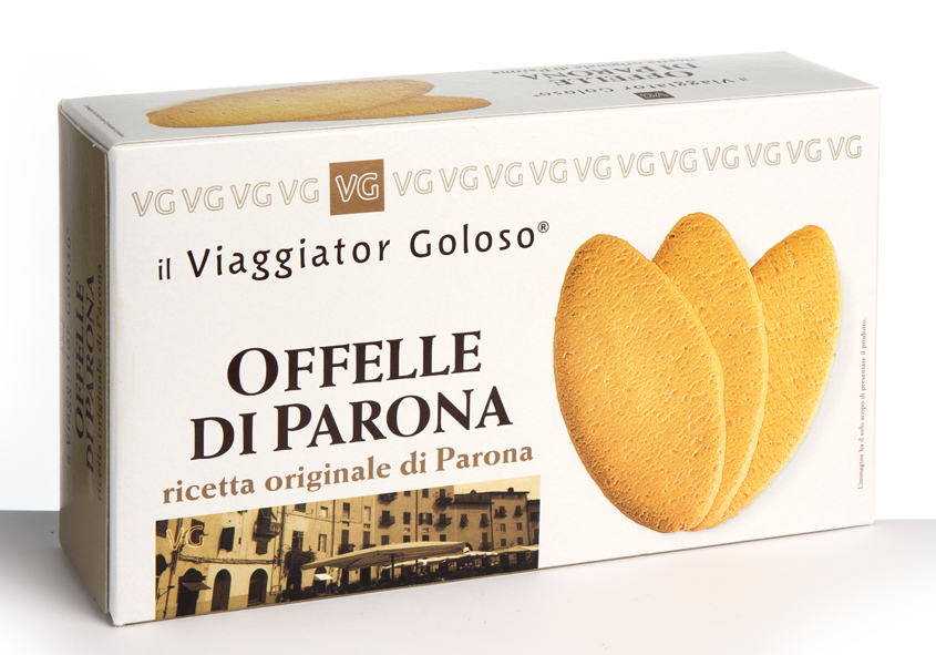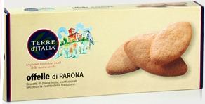 Viaggiator Goloso (marchio supermercati Unes), Offelle di Parona. Ingredienti: Farina di grano tenero tipo “0”, burro (latte ), zucchero, uova intere fresche, olio di oliva, agenti lievitanti (difosfato disodico, carbonato acido si sodio, amido di frumento). |