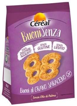 Céréal, Buoni Senza, Buoni al grano saraceno. Ingredienti: Fecola di patate, edulcoranti: maltitolo;amido di mais, farina di riso, olio di girasole, farina di grano saraceno 11,2%, uova, emulsionanti: mono- e digliceridi degli acidi grassi; aromi, sale, latte scremato in polvere, antiossidanti: estratto di rosmarino. Contiene lattosio. Può contenere tracce di soia. Un consumo eccessivo può avere effetti lassativi. Ricetta senza lievito e agenti lievitanti. |