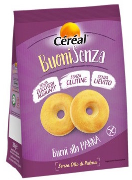 Céréal, Buoni Senza, Buoni alla panna. Ingredienti: Fecola di patate, farina di riso, amido di mais, edulcoranti: maltitolo; olio di girasole, farina di mais, burro, uova, panna 2,2%, emulsionanti: mono- e digliceridi degli acidi grassi; aromi, sale, latte scremato in polvere, antiossidanti: estratto di rosmarino. Contiene lattosio. Può contenere tracce di soia. Un consumo eccessivo può avere effetti lassativi. Ricetta senza lievito e agenti lievitanti. |