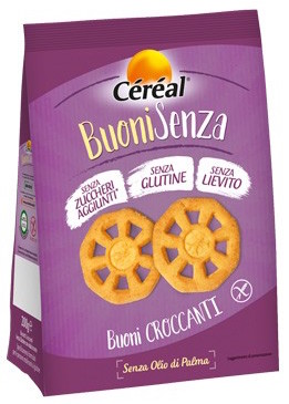 Céréal, Buoni Senza, Buoni Croccanti. Ingredienti: Fecola di patate, edulcoranti: maltitolo, amido di mais, farina di riso, olio di girasole, farina di mais, burro, uova, emulsionanti: mono- e digliceridi degli acidi grassi; aromi, sale, proteine del latte, latte scremato in polvere, antiossidantI: estratto di rosmarino. Contiene lattosio. Può contenere tracce di soia. Un consumo eccessivo può avere effetti lassativi. Ricetta senza lievito e agenti lievitanti. |