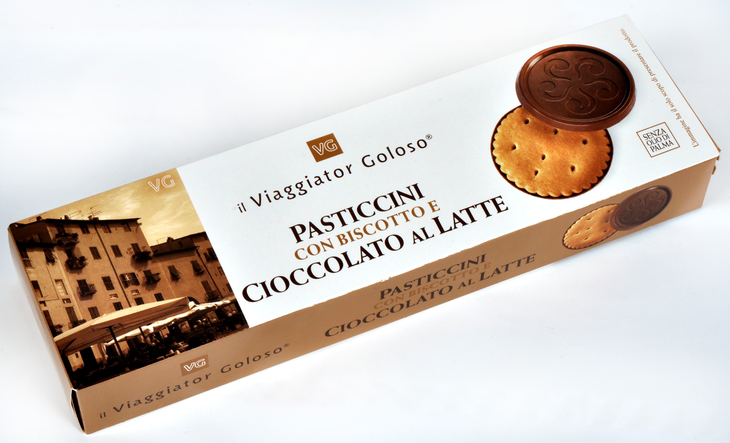 Viaggiator Goloso (marchio supermercati Unes), Pasticcini con biscotto e cioccolato latte. Ingredienti: Cioccolato al latte 56% (zucchero, burro di cacao, latte intero in polvere, pasta di cacao, emulsionante: lecitina di soia, aroma naturale di vaniglia), farina di frumento, zucchero, burro, amido di mais, uova, latte scremato in polvere, albume d’uovo, estratto di malto d’orzo, sale, agenti lievitanti (carbonati di ammonio, carbonati di sodio, acido tartarico), aromi. |