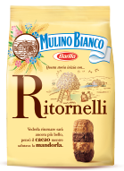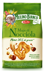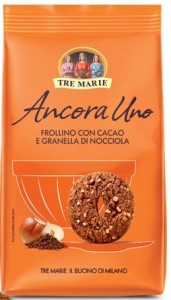 Tre Marie, Ancora uno. Frollino con cacao e granella di nocciola. Ingredienti: Farina di frumento, Zucchero di canna, Olio di mais, Nocciole 8%, Burro, Cacao 4,5%, Uova fresche, Destrosio, Sciroppo di glucosio – fruttosio, Amido, Agenti lievitanti (carbonato acido di sodio, carbonato acido di ammonio, tartrato monopotassico), Sale marino integrale, Aromi. Il prodotto può contenere tracce di latte, sesamo e altra frutta a guscio, quindi non è idoneo al consumo da parte di soggetti allergici a tali sostanze. |
