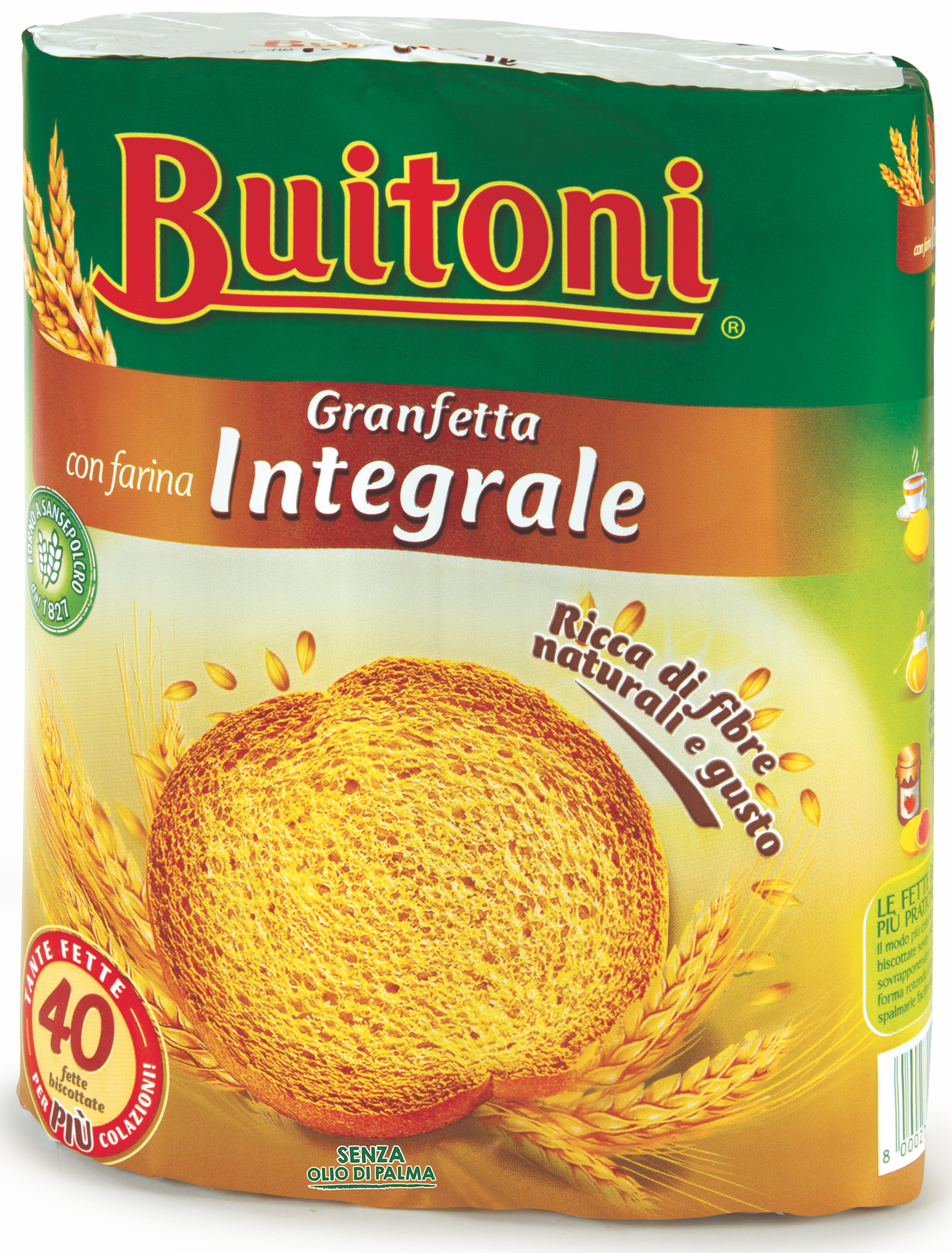 Buitoni, Granfetta integrale. Ingredienti: Farina di FRUMENTO, Farina integrale di FRUMENTO 39,6%, Destrosio, Olio di girasole, Lievito, Estratto di MALTO (da ORZO e mais), Sale, Può contenere tracce di LATTE e SOIA. |