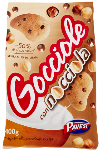 Pavesi, Gocciole con nocciola. Ingredienti: farina di FRUMENTO, zucchero, olio di semi di girasole, NOCCIOLE 2,2% corrispondente all’1,9% sul prodotto finito, BURRO, sciroppo di glucosio, cacao, amido di FRUMENTO, agenti lievitanti (carbonato acido di sodio, carbonato acido d’ammonio), sale, aromi (NOCCIOLA). Gocce di cioccolato 14,4%: cioccolato 50% corrispondente al 7,2% sul prodotto finito (zucchero, pasta di cacao, burro di cacao, cacao magro, emulsionante: lecitina di SOIA), cioccolato al latte 50% corrispondente al 7,2% sul prodotto finito (zucchero, LATTE intero in polvere, burro di cacao, pasta di cacao, emulsionante: lecitina di SOIA, aroma). Può contenere tracce di ALTRA FRUTTA A GUSCIO e UOVA. |