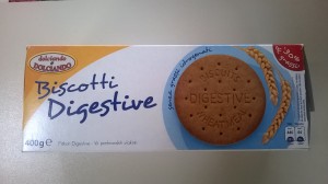 Dolciando (marca di Eurospin): biscotti Digestive. Ingredienti: farina integrale di frumento 64%, zucchero, olio di girasole altamente oleico, sciroppo di glucosio e fruttosio, agenti lievitanti: carbonato acido di sodio e carbonato acido di ammonio, sale. |