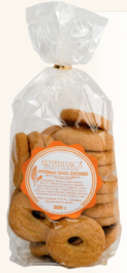 Doemi: Biscotti con olio extra vergine d’oliva senza zucchero aggiunto. Ingredienti: farina di grano tenero, edulcorante: maltitolo, olio extra vergine d’oliva (18%), uova, sale, agenti lievitanti: difosfato disodico, carbonato acido di sodio, bicarbonato d’ammonio. |