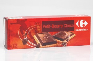 Carrefour: Petit beurre choco noir. Ingredienti: cioccolato amaro 48%(zucchero, pasta di cacao, burro di cacao, latte scremato in polvere, latte intero in polvere, emulsionante: lecitina di soia, aroma vaniglia), farina di frumento, zucchero, burro concentrato 6,5%, sciroppo di glucosio-fruttosio da frumento, sale, agente lievitante: carbonati acidi d’ammonio e di sodio – difosfato disodico, acidificante: acido citrico. Può contenere tracce di uova, di arachidi e di frutta a guscio. |