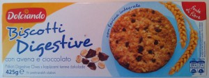 Dolciando (marca di Eurospin): Biscotti Digestive con avena e cioccolato. Ingredienti: fiocchi d’avena 34%, Farina integrale di frumento 22%, gocce di cioccolato fondente 15% (zucchero, pasta di cacao, destrosio, burro di cacao, emulsionante: lecitina di soia, aromi di vaniglia), olio di girasole alto oleico, zucchero, sciroppo di glucosio – fruttosio,agenti lievitanti: idrogenocarbonato di sodio e carbonati di ammonio, sale. Può contenere tracce di latte. |