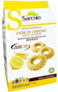 Sarchio: Fior di limone, biscotti senza latte e privi di glutine. Ingredienti: farina di riso*, uova* , sciroppo di riso*, zucchero di canna*, olio di semi di girasole non idrogenato* (6.5%), amido di mais*, addensanti: farina di semi di carrube*; agenti lievitanti: carbonato acido di sodio; aroma naturale di limone* (0,2%). *Prodotto biologico. Può contenere tracce di frutta a guscio e soia |