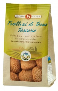 Scapigliati, Frollini di Terra Toscana. Ingredienti: farina di grano tenero, zucchero di canna*, burro*, farina integrale di farro*, latte intero fresco, olio extravergine di oliva, uova fresche pastorizzate*, sale, aroma naturale di vaniglia, polvere lievitante: bicarbonato di ammonio. * ingredienti biologici |