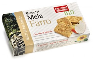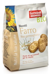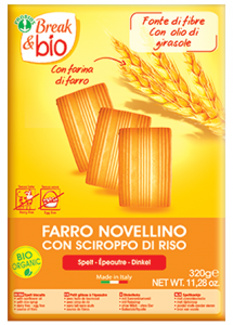 Probios: linea Break&bio, Farro novellino biologico. Ingredienti: *farina di farro, *sciroppo di riso, *olio di giralsole, *farina integrale di farro, *miele, *farina di lupini, *fecola di patate, agenti lievitanti (carbonato acido di sodio e ammonio, tartrato monopotassico, ), sale, *aroma naturale di zenzero e vaniglia. *biologico |