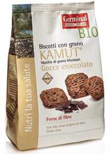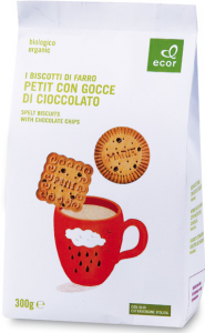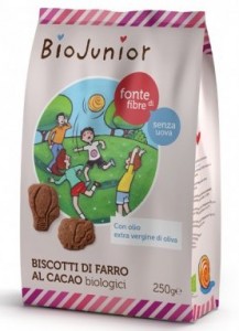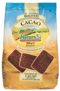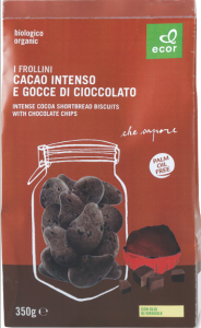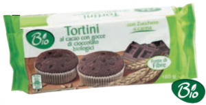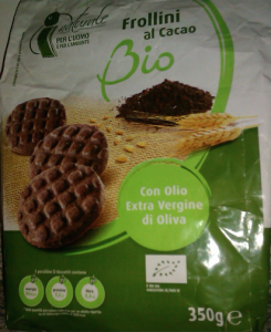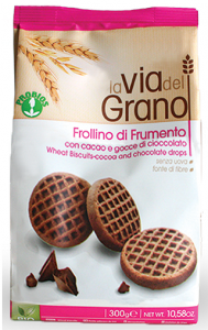 Probios: linea La via del grano, Frollini di frumento con cacao e gocce di cioccolato. Ingredienti: farina di grano tenero tipo “00”, *zucchero di canna, *olio di girasole, *sciroppo di frumento, gocce di cioccolato (*pasta di cacao, *zucchero di canna, emulsionante: lecitina di soia), *cacao magro polvere, *cruschello di frumento, *yogurt intero naturale, agenti lievitanti (carbonato acido di ammonio, carbonato acido di sodio, fosfato monocalcico), sale, *estratto naturale di cacao, aroma naturale. *biologico. |