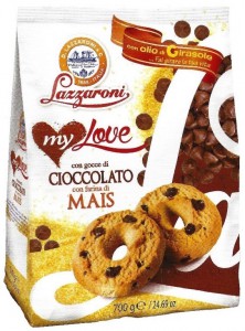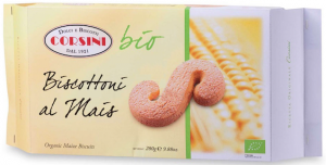 Corsini Bio, Biscottoni al mais. Ingredienti: farina di frumento* (contiene glutine)* (grano tenero tipo 0), farina di mais* 20%, zucchero grezzo di canna*, burro*, olio di semi di girasole*, uova*, agenti lievitanti (carbonato acido di sodio, carbonato acido di ammonio), sale, aromi naturali. (* da agricoltura biologica) – Può contenere tracce di frutta a guscio. |