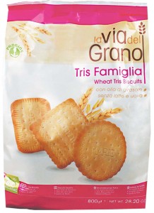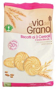 Probios: linea La via del grano, Biscotti ai 3 cereali biologici. Ingredienti: *farina di grano tenero tipo “0”, *zucchero di canna, *olio di girasole, *farina di orzo, *sciroppo di riso e orzo maltato, *farina di avena, *sciroppo di mais, *latte scremato in polvere, *fibra di mela, *fecola di patate, agenti lievitanti (carbonato acido di ammonio, monofosfato di calcio, carbonato acido di sodio), emulsionante: lecitina di girasole, sale, aroma naturale. *biologico |