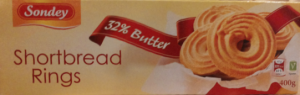 Sondey: Shortbread Rings. Ingredienti: farina di frumento, grasso butirrico (26,5%)*, zucchero, uova intere**, sale da cucina. *corrisponde al 32% di burro, **da allevamento a terra. Può contenere tracce di frutta a guscio |