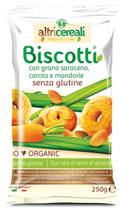 Probios, linea Altri cereali senza glutine, Biscotti grano saraceno, carota e mandorle. Ingredienti: *zucchero di canna, *farina di grano saraceno, *uova, *olio di semi di girasole, *amido di riso, *amido di mais, *farina di mais, *farina di riso, *purea di carota, *farina di mandorle tostate, agenti lievitanti (tartrato monopotassico, carbonato acido di sodio, carbonato acido di ammonio), sale, addensante: gomma di guar, aroma naturale, antiossidante: *estratti di rosmarino. *biologico |