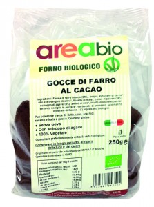 Area Bio: Gocce di farro al cacao. Ingredienti: Farina di farro bianco (29%)*, acqua, zucchero di canna*, olio extravergine di oliva*, fioretto di mais*, cacao in polvere (6%)*, sciroppo di agave (3%)*, amido di riso*, lievito in polvere (cremor tartaro), vaniglia in polvere*, carbonato di ammonio, sale marino integrale di Cervia. * ingredienti biologici. Può contenere tracce di: latte, uova, arachidi, sesamo e frutta a guscio. Contiene glutine. |