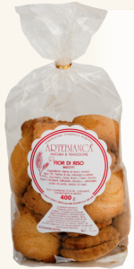Artebianca: Fior di riso. Ingredienti: farina di grano tenero tipo “0”, farina di riso macinata a pietra (15%), zuccheri, uova, burro, chiaro d’uovo, agenti lievitanti(difosfato disodico, carbonato acido di sodio, amido di mais). |