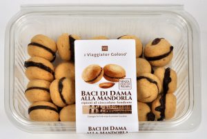 Viaggiator Goloso (marchio supermercati Unes), Baci di dama alla mandorla. Ingredienti: biscotto 90% (farina di frumento, burro (latte), zucchero, mandorle (15% corrispondente al 13,5% sul totale), tuorlo d’uovo pastorizzato, sciroppo di glucosio, aromi); ripieno al cioccolato fondente 10% (pasta di cacao, zucchero, burro di cacao, emulsionanti: lecitina di soia, aromi). |