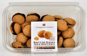 Viaggiator Goloso (marchio supermercati Unes), Baci di dama alla nocciola. Ingredienti: biscotto 90% (farina di frumento, burro (latte), zucchero, nocciole (10% corrispondente al 9% sul totale), tuorlo d’uovo pastorizzato, sciroppo di glucosio, cacao, aromi); ripieno al cioccolato fondente 10% (pasta di cacao, zucchero, burro di cacao, emulsionanti: lecitina di soia, aromi). |
