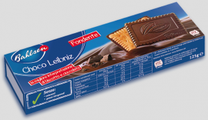 Bahlsen, Choco Leibniz biscotti con cioccolato fondente. Ingredienti: Zucchero, Farina di frumento, Pasta di cacao, Burro di cacao, Burro 3,7%, Sciroppo di glucosio, Derivati del siero di latte, Burro anidro, Siero di latte in polvere, Emulsionante: lecitine (di soia), Agenti lievitanti: bicarbonato di sodio e difosfato disodico, Latte intero in polvere, Sale, Correttore d’acidità: acido citrico, Aromi, Tuorlo d’uovo in polvere |