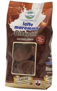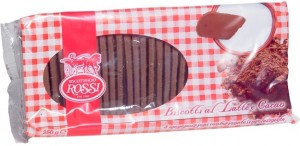 Rossi Biscottificio, Biscotti al latte e cacao. Ingredienti: farina di frumento, zucchero, burro, latte int. conc. e zucch. 9%, latte p.scr. 6%, cacao in polvere 3.5%, malto, ag. lievitante bicarbonato di sodio, sale marino |