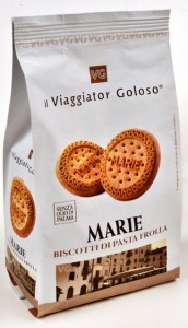 Viaggiator Goloso (marchio supermercati Unes), Marie biscotti di pasta frolla. Ingredienti: Farina di frumento (grano tenero tipo”0″), zucchero, burro, uova, albume d’uovo, latte scremato in polvere, estratto di malto d’orzo, agenti lievitanti: carbonato acido di ammonio-carbonato acido di sodio, sale, emulsionante: lecitina di soia, aromi naturali. |