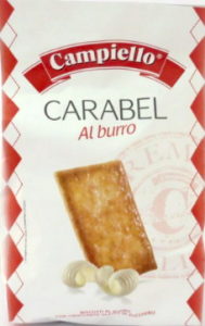 Campiello, Carabel al burro. Ingredienti: Farina di frumento, zucchero, burro 19%, vino, latte intero in polvere, destrosio, agenti lievitanti: carbonato acido di ammonio, carbonato acido di sodio; sale |