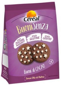 Céréal, Buoni Senza, Buoni al Cacao. Ingredienti: Fecola di patate, edulcoranti: maltitolo; amido di mais; olio di girasole, farina di riso, farina di mais, cacao 3,7%, glassa (edulcoranti: maltitolo; amido di mais, albume d’uovo), uova, aromi, emulsionanti: mono- e digliceridi degli acidi grassi;sale, latte scremato in polvere, antiossidanti: estratto di rosmarino. Contiene lattosio. Può contenere tracce di soia. Un consumo eccessivo può avere effetti lassativi. Ricetta senza lievito e agenti lievitanti. |