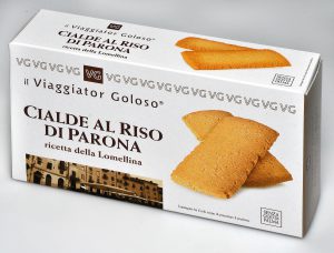 Viaggiator Goloso (marchio supermercati Unes), Cialde al riso di Parona. Ingredienti: Farina di grano tenero tipo “0”, zucchero, burro (latte),farina di riso 8%, agenti lievitanti (difosfato disodico, carbonato acido si sodio, amido di frumento), latte scremato in polvere. |