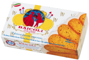 Colussi, Baicoli. Ingredienti: Farina di frumento, zucchero, burro, fibra di avena, latte intero in polvere, estratto di malto d’orzo e mais, sale, lievito di birra. Contiene glutine e latte. Può contenere uova e frutta a guscio. |