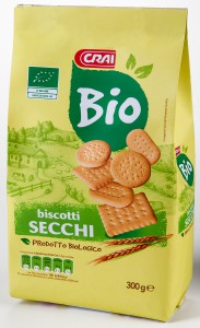 Crai, Bio, Biscotti secchi. Ingredienti: farina di frumento*, zucchero di canna*, burro*, sciroppo di glucosio-fruttosio*, amido di frumento*, uova*, latte intero in polvere*, estratto di malto d’orzo*, agenti lievitante (carbonato acido di sodio, carbonato acido di ammonio, tartrato monopotassico), sale marino, aromi naturali. *Biologico. Allergeni – Contiene: glutine, latte e derivati, uova. Può contenere tracce di sesamo, nocciole e altra frutta a guscio. |