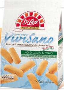 DiLeo: ViviSano Biscotti con olio extravergine di oliva (7,7%) e farina di Riso. Ingredienti: farina di frumento, zucchero, uova fresche pastorizzate, olio extravergine di oliva 7,7 %, farina di riso 3,8%, fecola di patate, proteine del latte, latte magro in polvere, agenti lievitanti: carbonato acido d’ammonio, carbonato acido di sodio, sodio pirofosfato acido; emulsionante: lecitina di soia; sale, aromi. Il prodotto può contenere tracce di frutta a guscio. |
