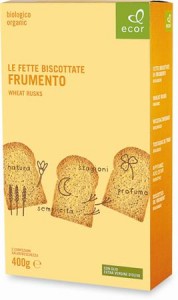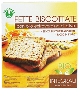 Probios, Fette biscottate integrali. Ingredienti: *farina integrale di frumento, *olio extra vergine di oliva, *glutine di frumento, lievito di birra, sale. *biologico. |