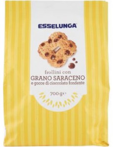 Carrefour, Biscotti con zucchero di canna e grano saraceno. Ingredienti: farina di frumento, zucchero di canna 14,6%, olio di semi di mais 12,5%, zucchero, farina di fiocchi di avena, farina di grano saraceno 6,4%, burro, latte intero in polvere, latte intero fresco pastorizzato, uova, melasso, agenti lievitanti (carbonato acido di sodio, tartrato monopotassico, carbonato acido di ammonio), sale, emulsionante: lecitina di girasole, aroma. |