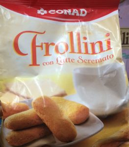 Conad, Frollini con latte scremato. Ingredienti: farina di frumento, zucchero, uova, olio di mais, fecola di patate, proteine del latte, latte scremato in polvere 1%, agenti lievitanti: carbonato acido di sodio, carbonato acido di ammonio; emulsionanti: lecitina (di soia); sale. aromi. |