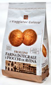 Viaggiator Goloso (marchio supermercati Unes), Frollini Farina integrale e Fiocchi di avena. Ingredienti: Fiocchi d’avena 32%, farina di frumento integrale 31%(farina di grano tenero, crusca di grano tenero), zucchero, olio di semi di girasole, burro, sciroppo di glucosio, sale, agenti lievitanti: carbonato acido di sodio-carbonato acido di ammonio, emulsionante: lecitina di soia, aromi naturali. |