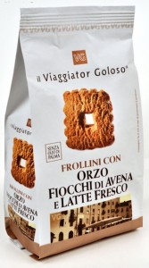 Viaggiator Goloso (marchio supermercati Unes), Frollini con orzo, Fiocchi di avena e Latte fresco. Ingredienti: Farina di frumento (grano tenero tipo”0″), zucchero grezzo di canna, burro, fiocchi d’avena, farina d’orzo 8%, latte fresco 6% uova, olio di semi di girasole , amido di mais, orzo solubile 1.3%, agenti lievitanti: difosfato disodico-carbonato acido di sodio, sale, aromi naturali |