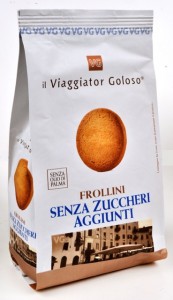 Viaggiator Goloso (marchio supermercati Unes), Frollini senza zuccheri aggiunti. Ingredienti: Farina di frumento (grano tenero tipo”0″), edulcorante: maltitolo, burro, amido di mais, olio di semi di girasole, latte scremato in polvere, tuorlo d’uovo,agenti lievitanti: difosfato disodico -carbonato acido di sodio, emulsionante: lecitina di soia, sale, aromi naturali. |