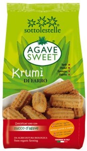 Sotto le stelle, linea Agave Sweet, Krumì di farro. Ingredienti:farina di farro*, sciroppo d’agave*, olio di girasole*, olio extra vergine d’oliva*, carbonato acido di sodio, aroma caramello* |