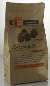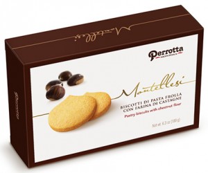 Perrotta, Montellesi Biscotti di pasta frolla con farina di castagne. Ingredienti: farinna di grano tenero tipo “00”, burro, zucchero, uova, farina di castagne (15%), farina di mais, lievito, sale. Può contenere tracce di frutta in guscio. |