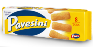 Pavesi: Pavesini. Ingredienti: Zucchero 46,6%, farina di frumento, uova 24,9%, agenti lievitanti (carbonato acido d’ammonio, carbonato acido di sodio), zucchero caramellato, aroma vanillina. Prodotto in uno stabilimento che utilizza anche latte, soia, frutta a guscio, sesamo, arachidi. |