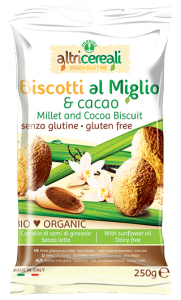 Probios, linea Altri cereali senza glutine, Biscotti al miglio e cacao. Ingredienti: *zucchero di canna, *uova, *farina di miglio, *farina di riso, *fecola di patate, *olio di semi di girasole, *amido di riso, *crusca di riso, *cacao magro in polvere, addensante: *gomma arabica, agenti lievitanti (tartrati di potassio, carbonati di sodio, carbonati di ammonio), sale, aroma naturale, *estratto di cacao 0,08%, antiossidanti: *estratti di rosmarino. *biologico |