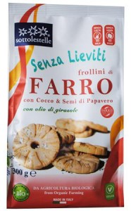 Sotto le stelle, Frollini di farro con cocco e semi di papavero bio. Ingredienti: farina di farro*, sciroppo di riso*, olio di girasole*, amido di mais*, cocco grattuggiato*, sciroppo di mais*, semi di papavero*, aroma naturale*. *da agricoltura biologica. Frollini prodotti senza lievito, nè uova, nè latte, dolcificati con sciroppo di riso. |