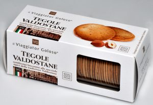 Viaggiator Goloso (marchio supermercati Unes), Tegole valdostane. Ingredienti: farina “00”, zucchero. nocciole 27%, albume d’uovo, amido di mais, aromi. |