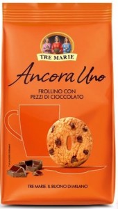 Tre Marie, Ancora uno. Frollino con pezzi di cioccolato. Ingredienti: Farina di frumento, Zucchero di canna, Cioccolato extra fondente 16% (zucchero, pasta di cacao, burro di cacao, emulsionante: lecitina di soia, estratto naturale di vaniglia), Olio di mais, Burro, Uova fresche, Destrosio, Sciroppo di glucosio – fruttosio, Amido, Agenti lievitanti (carbonato acido di sodio, tartrato monopotassico), Sale marino integrale, Aromi. Il prodotto può contenere tracce di latte, sesamo, nocciole e altra frutta a guscio, quindi non è idoneo al consumo da parte di soggetti allergici a tali sostanze. |