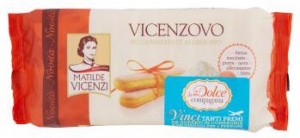 Vicenzi, Vicenzovo savoiardi. Ingredienti: Zucchero, Farina di frumento, Uova fresche 26%, Farina di frumento macinata a pietra 4%, Sciroppo di glucosio, Agenti lievitanti (carbonato acido di ammonio, carbonato acido di sodio, difosfato disodico), Aromi naturali. Prodotto solo con uova fresche da allevamento a terra di cat. A appena sgusciate e pastorizzate. |